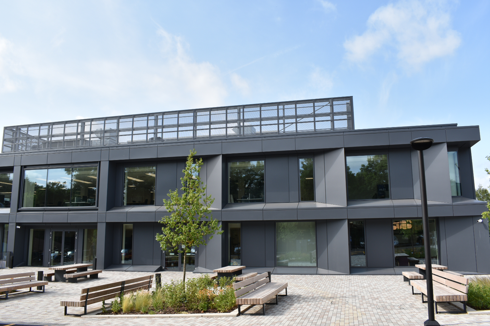 18 Mole Business Park is a 98,000 sq ft building and incorporates a sustainable workspace, which has become the ‘ Surrey and Borders, NHS Foundation Headquarters.A very technical build of Vantage DF panels and Perforated Panels all coated in Steel Blue Grey ref 2215F lends itself to a stunning end result.