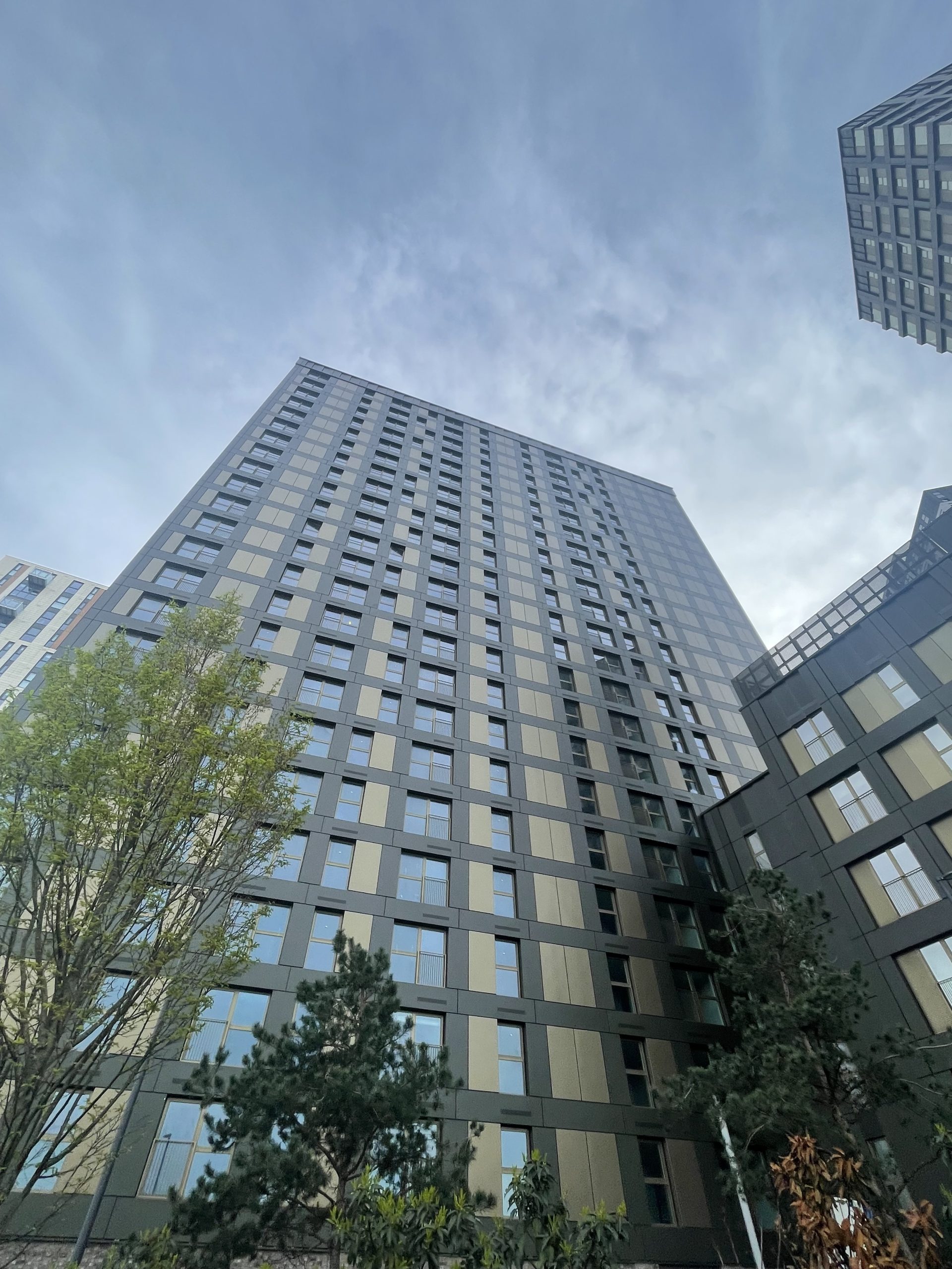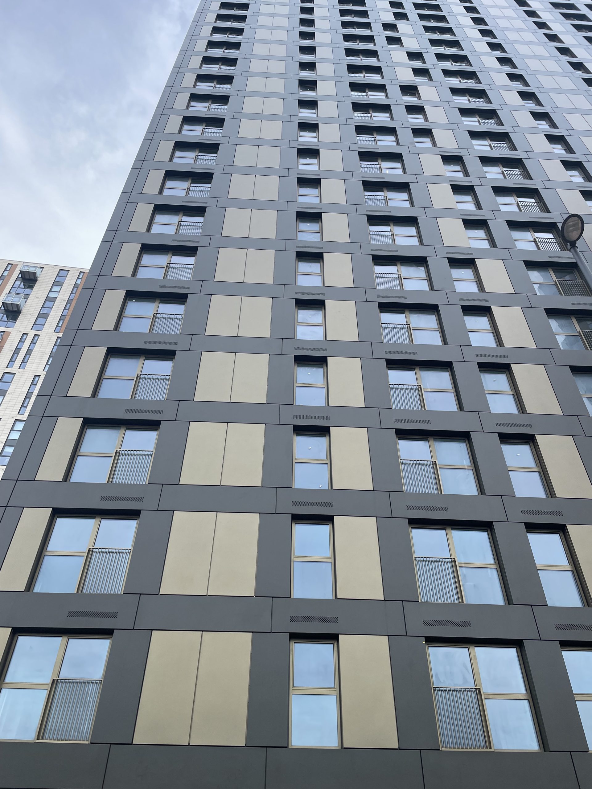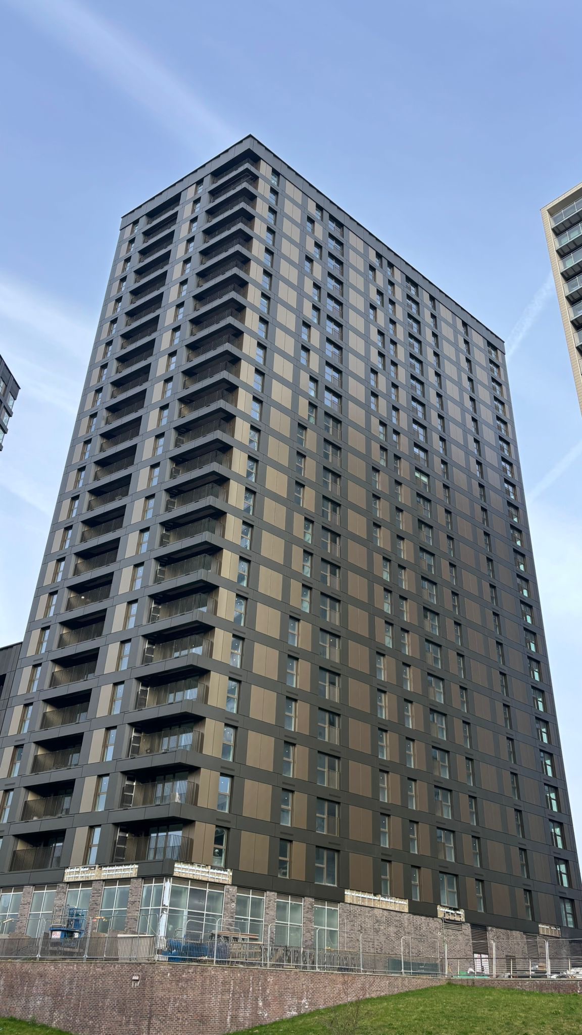 Vantage DF®️ was chosen to complement the colour scheme used on the neighbouring Salford New Bailey C1, helping C2 blend seamlessly while still appearing fresh. Installation was completed from mast climbers across four elevations, phased by elevation and floor bands up to level 23.