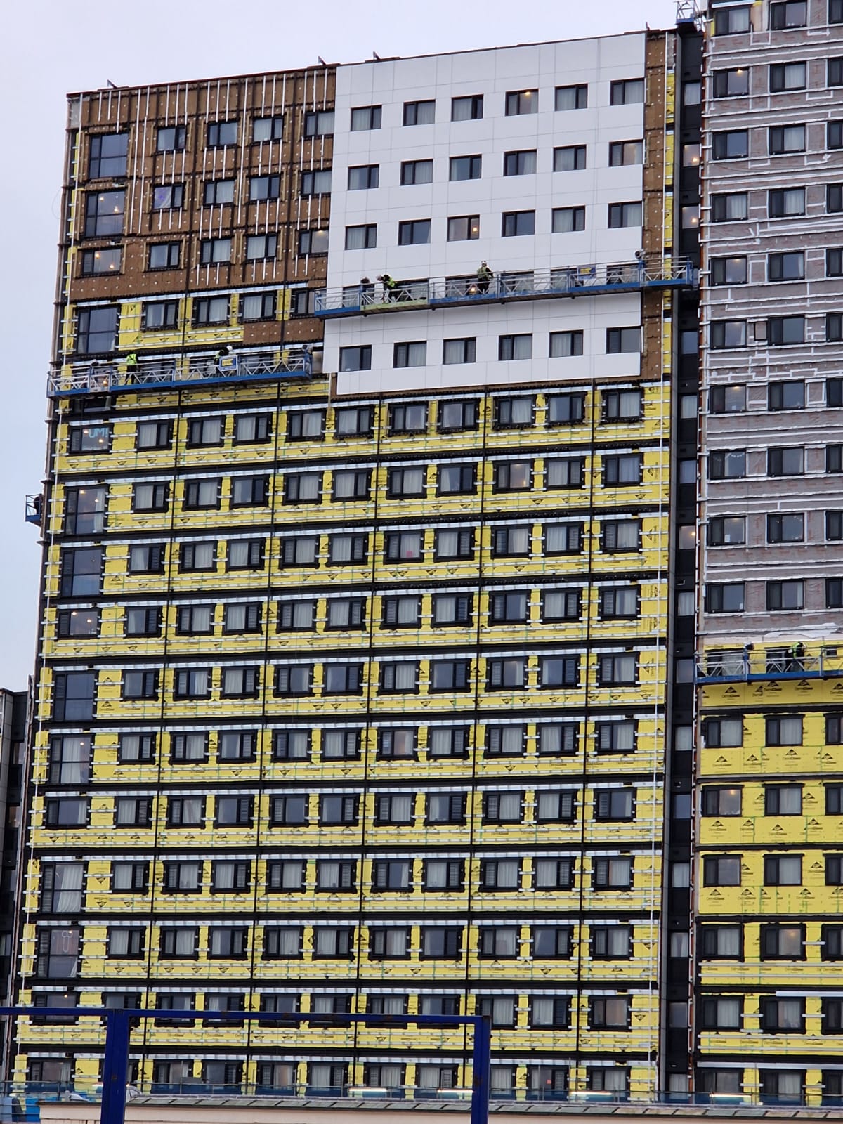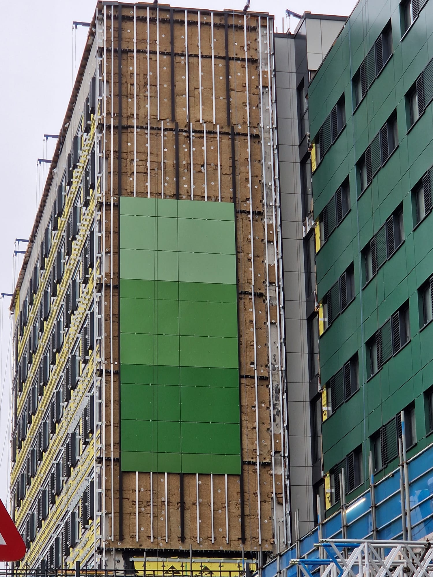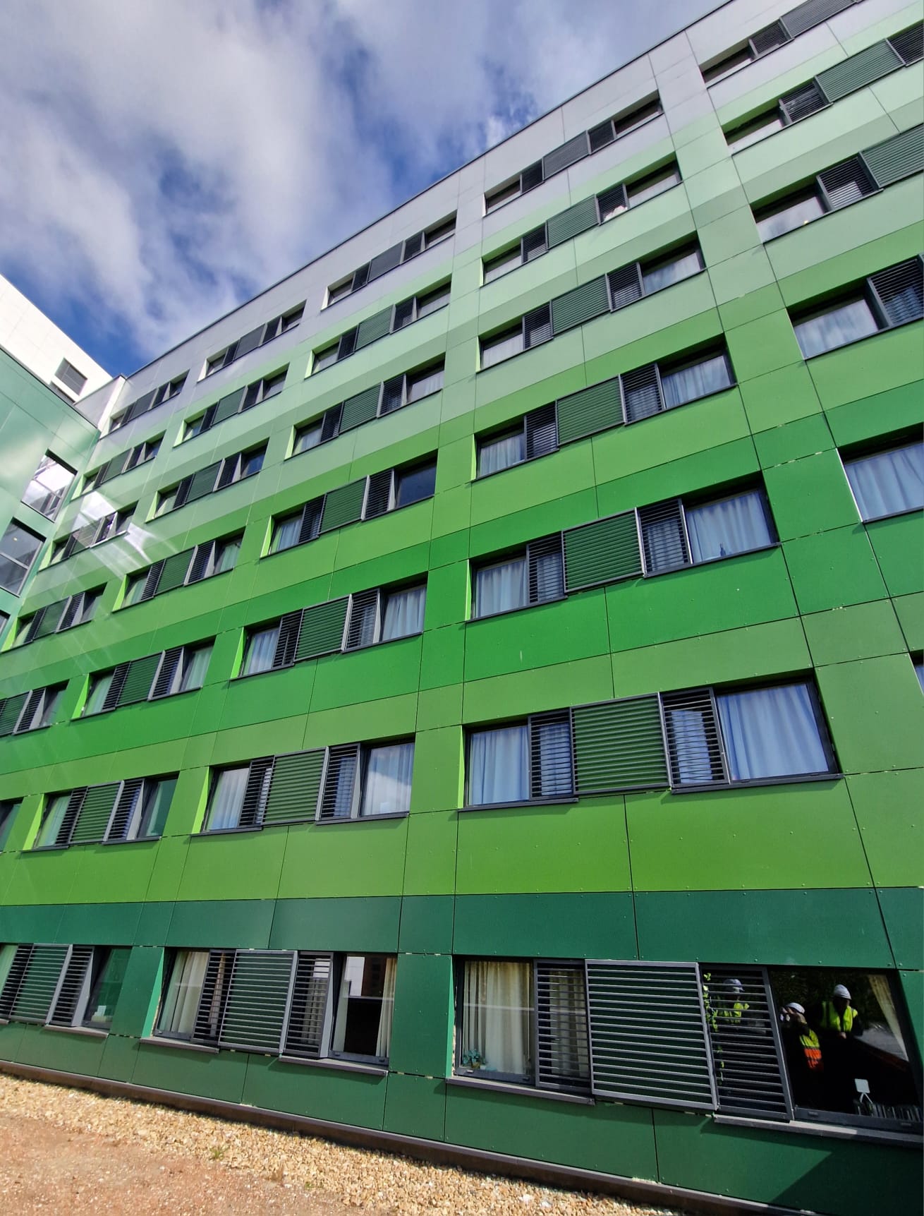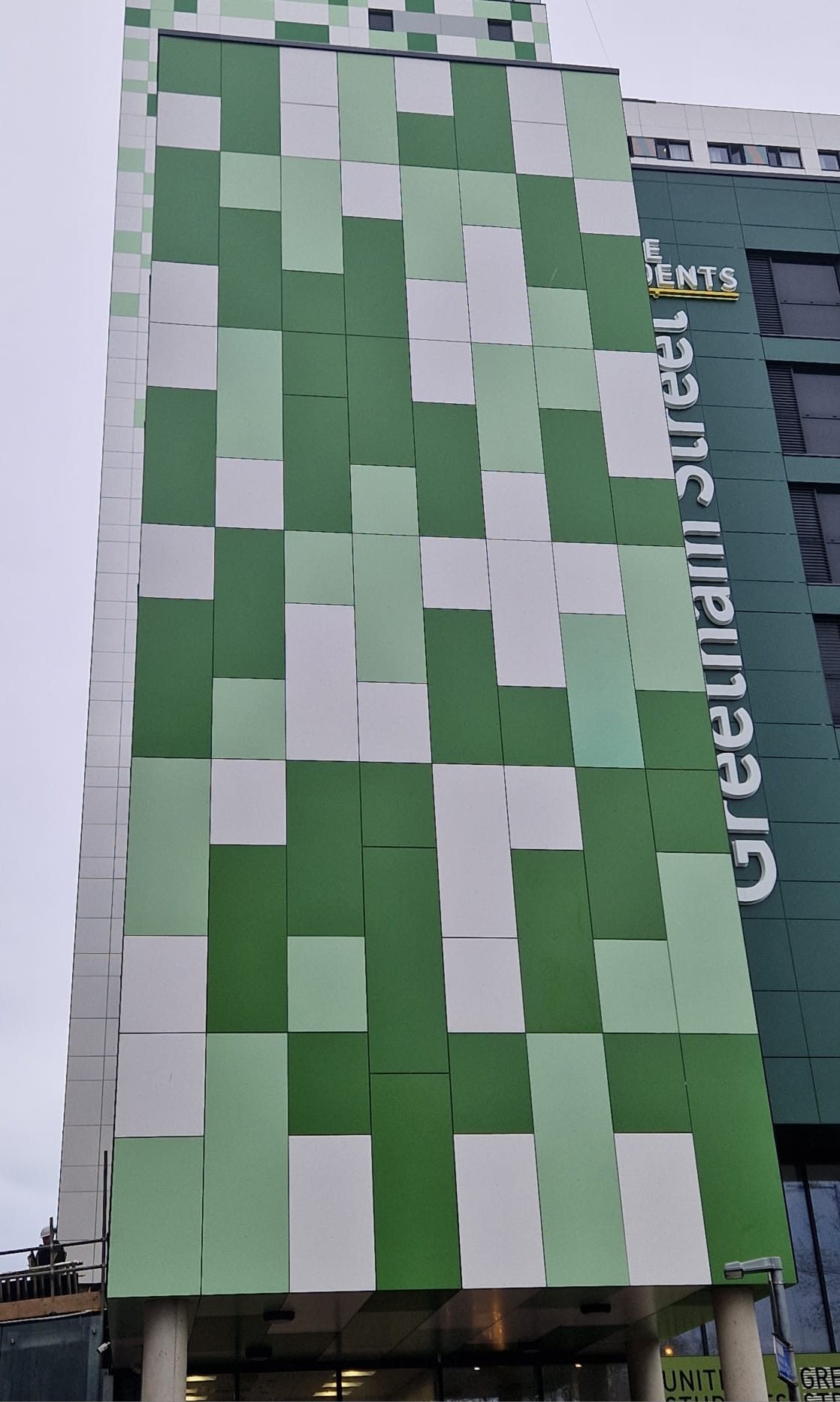 The project comprises a total of 836 bedrooms split between 75 studio flats and 761 cluster flat bedrooms. The site was bisected in two halves by a road which the student accommodation spans to a height of 16 stories. External elevations consist of an aluminium rainscreen cladding, aluminium framed windows and louvres to achieve the planning requirement for colour variation and a crisp, futuristic appearance. Over 6000m2 Aluminium 3mm powder coated rainscreen system was supplied in Vantage®️ MF (Mechanical Fix) to replace ACM cladding in nine different colours, varying from white, silver, grey to various greens.