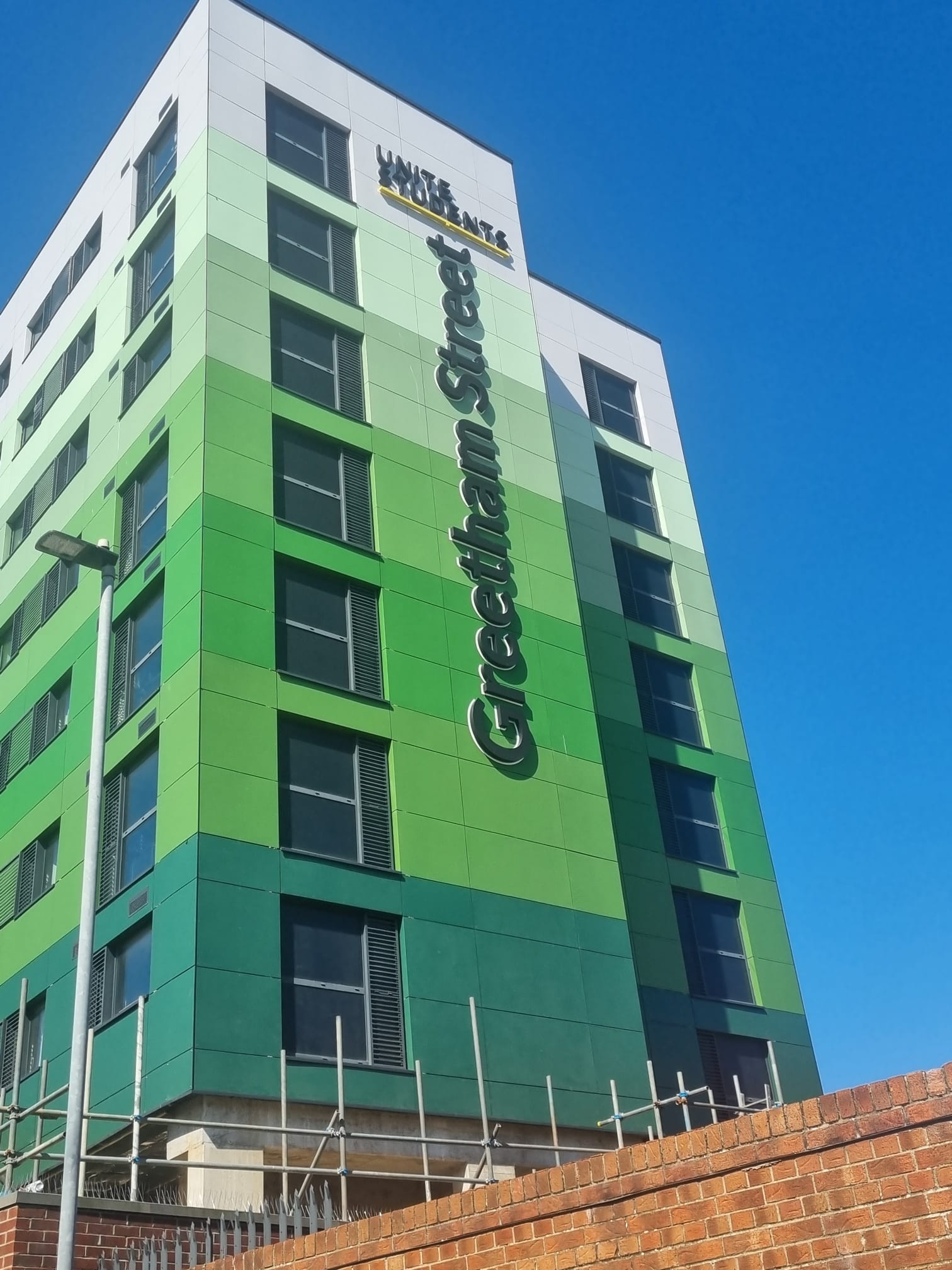 “The new façade at Greetham Street for Unite Students looks fantastic, and RG group along with our client are very happy with the finish. The vantage MF aluminium panels supplied by BTS facades and installed by Metclad, really make the colours pop and will no doubt look great for years to come.”
